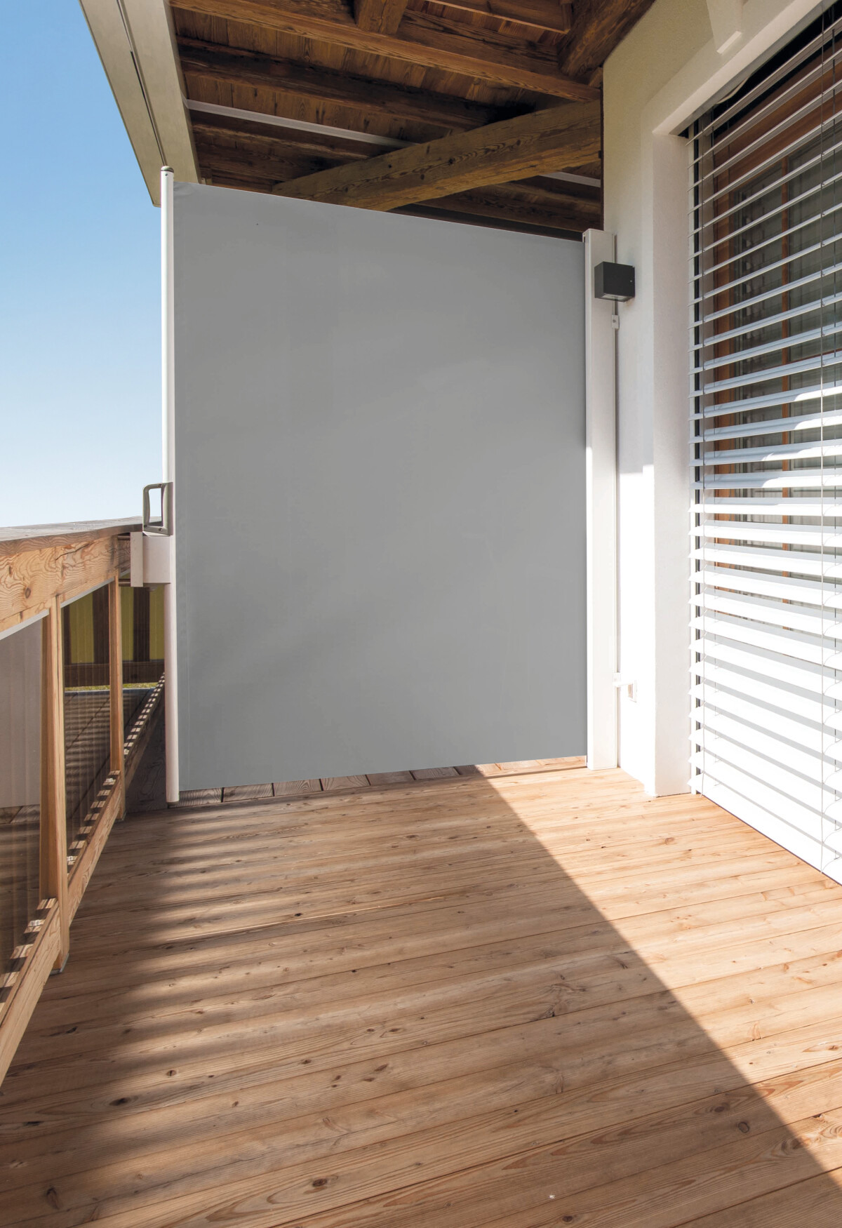 Praktisches Senkrechtrollo für Markisen PALMA und CLASSIC. Dieser Zusatzschutz vor tief stehender Sonne wird manuell mit einer Kurbel heruntergelassen. Höhe ca. 150 cm.